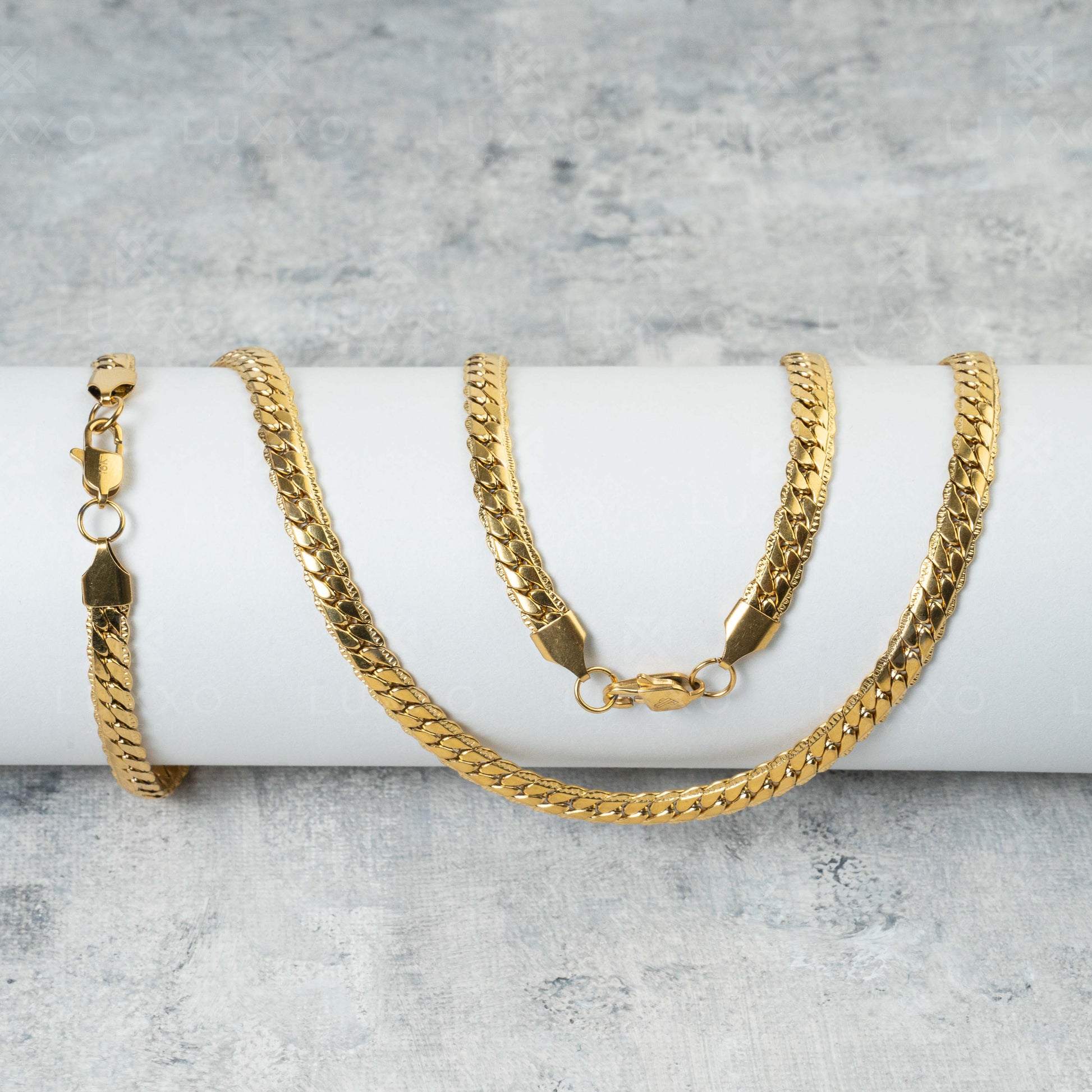 Combo de Cadena y Pulsera de Oro Laminado Italiano 18K con diseño clásico y acabado brillante. Combina elegancia y durabilidad. Una pieza resistente que mantiene su belleza a lo largo del tiempo, ideal para realzar cualquier look. Todas nuestras joyas son contramarcadas en sus broches (por un lado el doble lingote que nos identifica y por le otro el 18K).