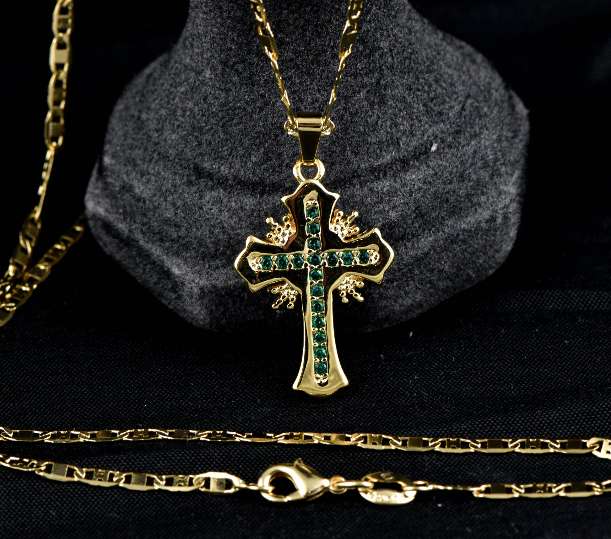 Cadena Cubana Plana en H 65cms + Colgante Cruz Sagrada Circonia Verde